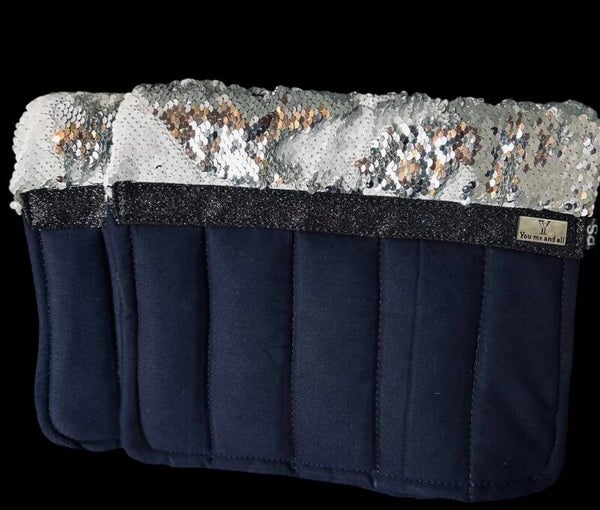 Entdecke die neuen Bandagierunterlagen in elegantem Weiß oder tiefem Dunkelblau, die nicht nur funktional, sondern auch ein echter Blickfang sind! Diese hochwertigen Unterlagen sind mit schimmernden Wende-Pailletten in Weiß und Silber ausgestattet, die je nach Stimmung und Outfit angepasst werden können.